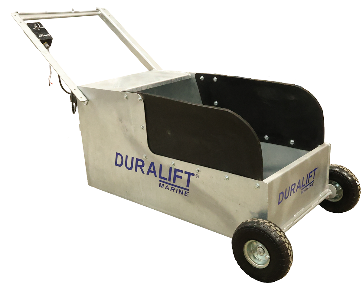 The 2' x 4' tub is mounted on 10" rubber tire casters, allowing smooth positioning around the sterndrive or outboard motor.